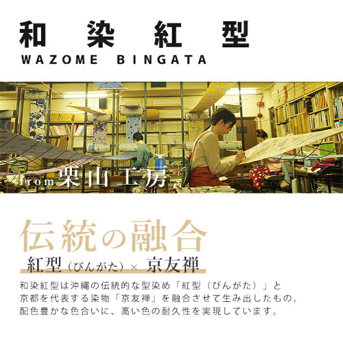 「紅型」(沖縄)×「京友禅」(京都) 和染紅型は沖縄の伝統的な型染め「紅型(びんがた)」と京都を代表する染物「京友禅」を融合させて生み出したもの。